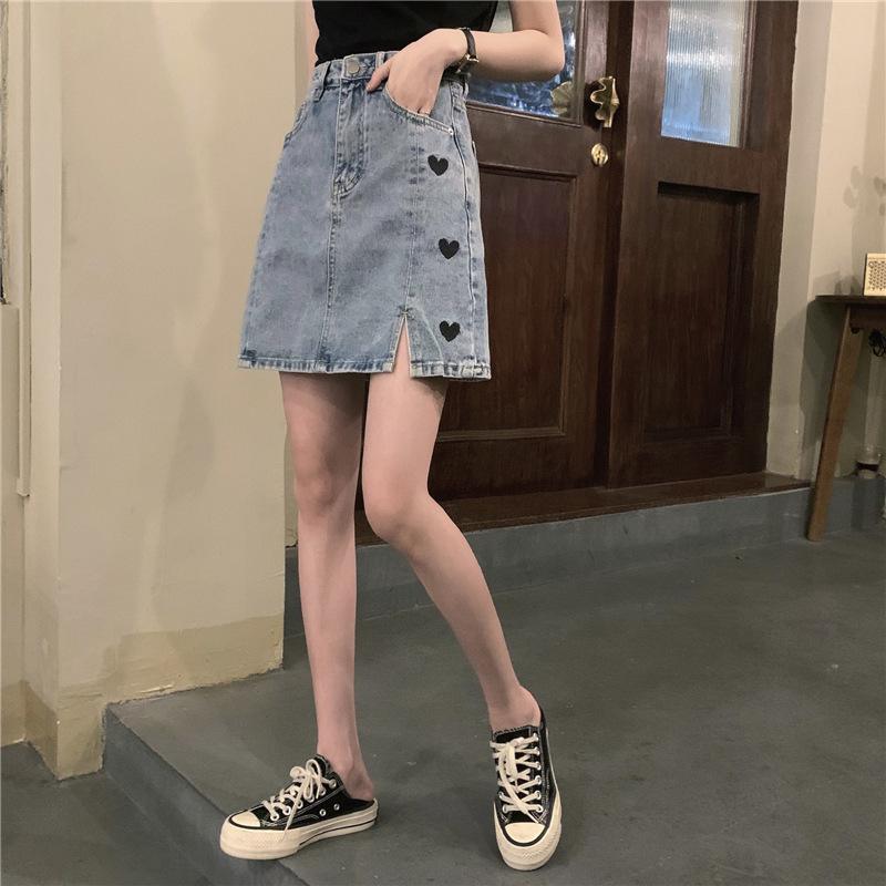 爱心刺绣牛仔短裙女夏2021新款开叉设计感显瘦高腰a字半身裙热门设计联盟服务商